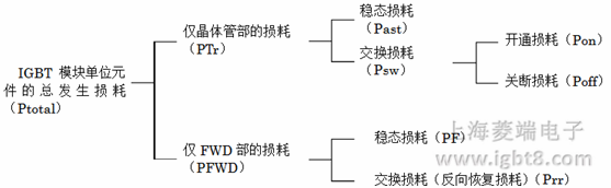 IGBT模塊由IGBT部分和FWD部分構(gòu)成,IGBT模塊的損耗源于內(nèi)部IGBT和反并聯(lián)二極管(續(xù)流FWD、整流)芯片的損耗,它們各自發(fā)生的損耗的合計即為IGBT模塊整體發(fā)生的損耗。另外發(fā)生的損耗可分為穩(wěn)態(tài)和交換損耗。如對上述內(nèi)容進行整理可表述如下。
